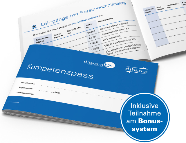 Mit dem dibkom Kompetenzpass dokumentieren Sie Ihre Qualifikationen und Fachkompetenzen im Bereich Planung, Installation, Montage und Servicearbeiten in Telekommunikationsnetzen – gemäß den Ausbildungsrichtlinien der dibkom gGmbH.
